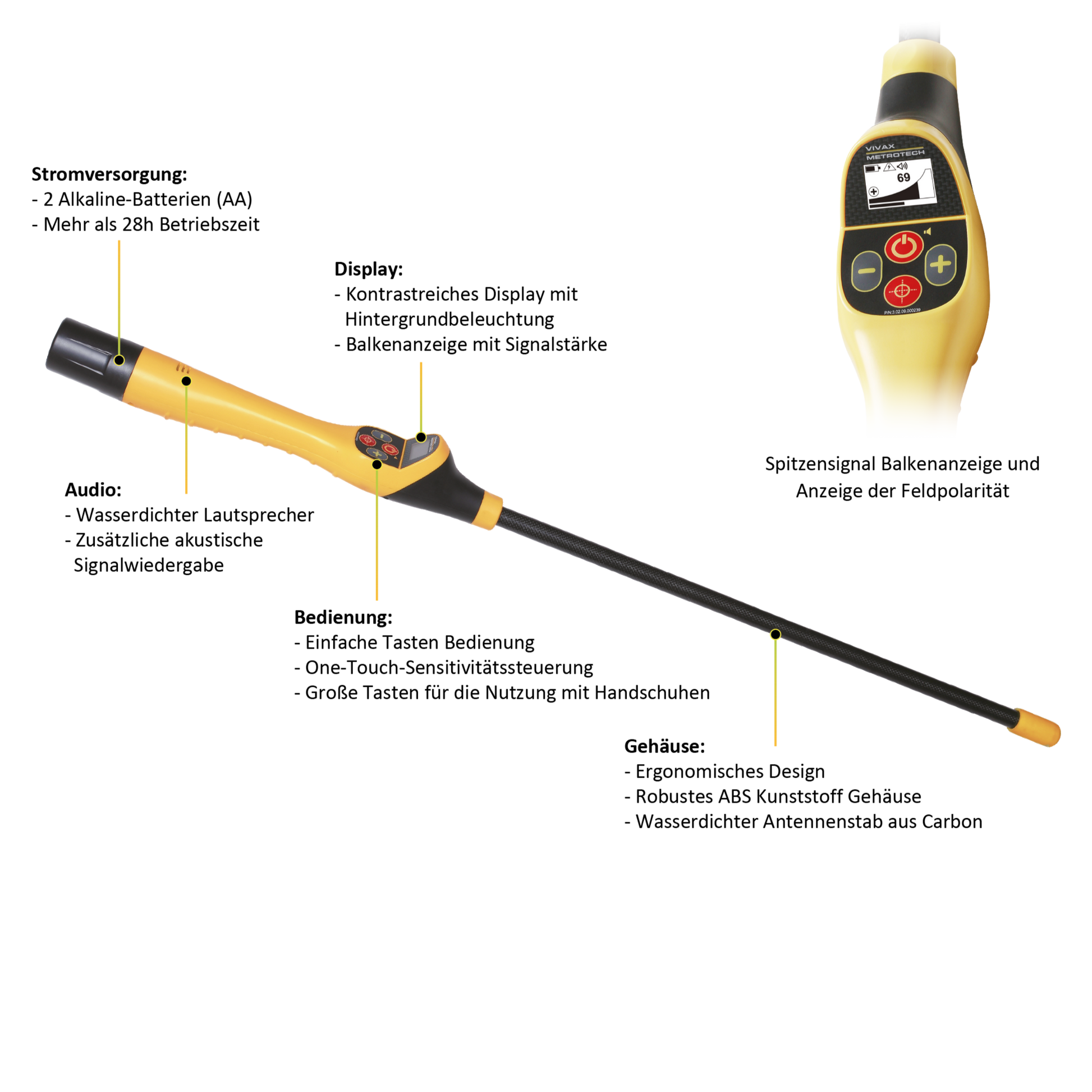 The vivax vScanM cable locator with metal detection function was developed for simple and cost-effective cable and object detection. The metal detection function of the vScanM enables the detection of manhole covers, slide caps and other metallic objects. Thanks to the user-friendly operation and comprehensive frequency coverage, it is ideal for professional users and beginners alike.